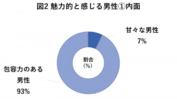 魅力的と感じる男性の内面について質問を行ったところ、「甘々な男性」と回答した方が7%に対し、「包容力のある男性」と回答した方は93%みられました。