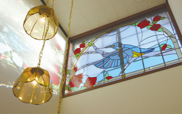 ステンドグラス窓は、外からの視線を遮りプライバシーをも守ってくれるだけでなく、太陽光が差し込むことで色ガラスの色彩を壁や床に映し出すので、幻想的な空間を創造してくれます。陽のさす時間帯によって異なった色彩表情を発見するのも楽しい限りです。