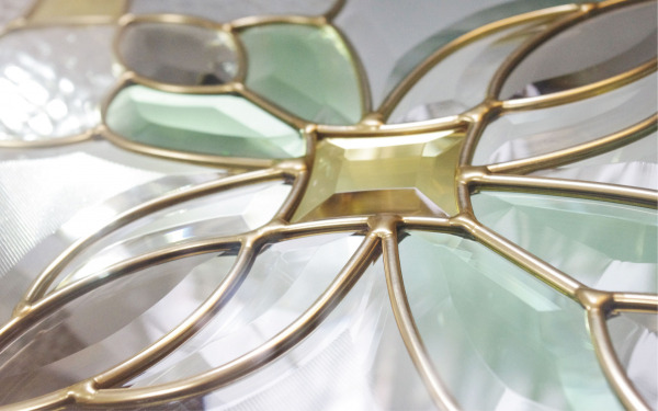 また、セブンホームのステンドグラスの特長は、5mm厚の色ガラスを用い、そのフチを削り磨き上げた「面取りガラス」を交えていますので、その部分の色ガラスは乱反射してキラキラと光輝きます。従来の平面的な色合いのステンドグラスとは一線を画すもので、通常の3mm厚の色ガラスとあいまって、立体的な美しさをも醸し出します。
