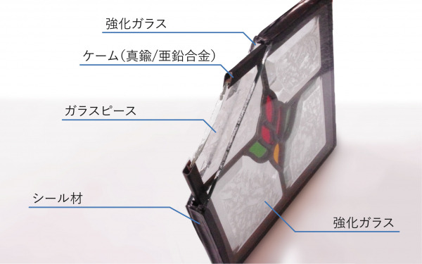 セブンホームのステンドグラスは機能面においても優れています。それはステンドグラスの表・裏を強化ガラスでサンドイッチした「三層構造」にあります。1.04kgの鋼球を1.5mから落下させても無傷。ハンマーで叩いても割れません。昨今は墓石にも採用されています(ピュア・メモリアル)。