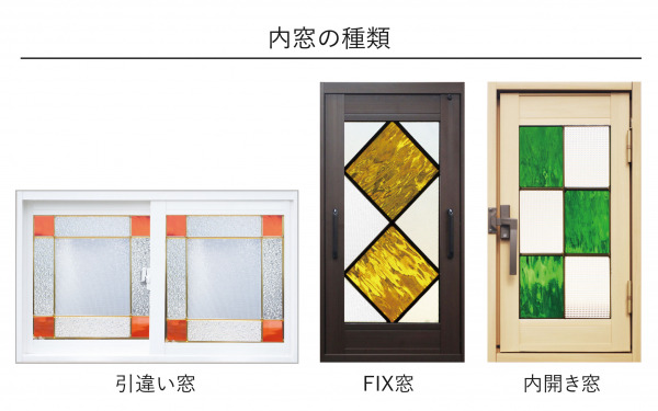 なお、防火地域・準防火地域などの規制があります場合は、既存の窓をそのままに、内側にサッシを設ける内窓ピュア・ステンドグラスがお勧めです。内窓サッシもmm単位の大きさでお作りできますうえ、「引き違い式」・「内開き式」・「FIX(脱着式)」の3つのタイプからお選びいただけます。