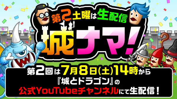 株式会社アソビズム(本社:東京都千代田区、代表取締役:大手智之)は、App Store・Google Playにて好評配信中の『城とドラゴン』の公式YouTubeチャンネルで、生配信企画「城ナマ!」を第2土曜に配信。第2回目を7月8日(土)にライブ配信いたします。
