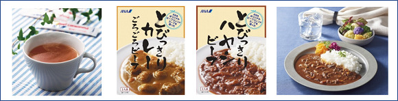 ANA便(国内線)機内で、長い間ご好評いただいているANAオリジナルビーフコンソメスープは、牛肉の風味を活かしたエキスに野菜の旨味をプラスしたコクのある味わいで、誕生以来多くの方に親しまれています。このANAオリジナルビーフコンソメスープの味わいを活かしたANAフーズオリジナル商品が「ANAオリジナルビーフコンソメスープを使った とびっきりシリーズ」です。同シリーズの『ANAオリジナルビーフコンソメスープを使った とびっきりカレーごろごろビーフ』は販売開始以来、14年目となるベストセラー商品で、年間約16万個を販売しています。また、昨年、新商品として『とびっきりハヤシビーフ』も販売を開始し、人気商品となっています。ANA FESTA(一部店舗)やA-style(https://www.astyle.jp/sc/press141)などでお買い求めいただけます。