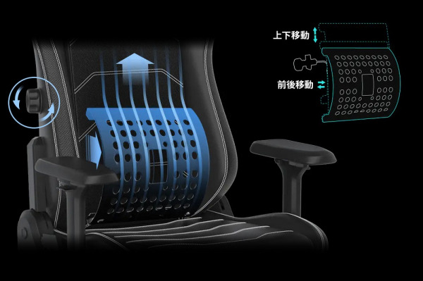 側面のダイヤル操作により、背もたれに内蔵されたビルトインランバーサポートが、高密度モールドウレタンフォームを前後、上下の4方向に押し出し、ユーザーの背面を広範囲にサポートします。ランバーサポートをユーザーのお好みの位置に設定し、長時間のデスクワークにおける疲労軽減に役立ちます。