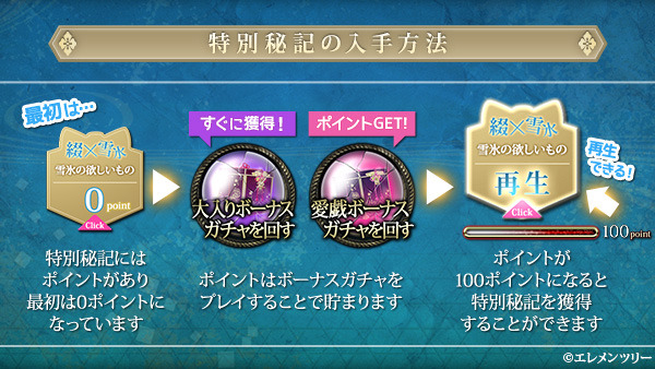 ・ポイントが100ポイントになると、特別秘記を獲得することができます。