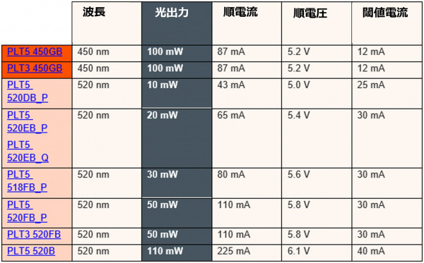 加えて、新しいレーザーは、動作電流・電圧、およびレーザー発振の閾値電流の最大値が低い、という特徴を備えています。例えば、30mWの緑色レーザー(PLT5 518FB_P)の最大閾値電流は、前世代のPLT5製品が60mAであったのに対し、最新バージョンでは約25%低減され、45mAとなっています。