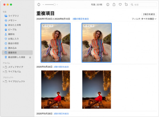 Macの写真アプリには、重複するデータを簡単に削除できる機能があります。なお、Macでは重複したデータを整理することを「結合」といいます。