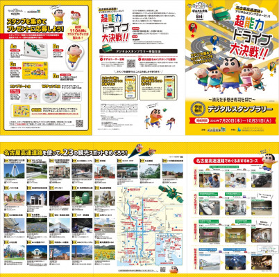 名古屋高速道路及び周辺有料道路の沿線を中心に愛知県内のおすすめ観光スポット23箇所をめぐり、スマートフォン等を使ってデジタルスタンプを集めると、「しん次元!クレヨンしんちゃん」オリジナルグッズや名産品などが抽選で当たります。