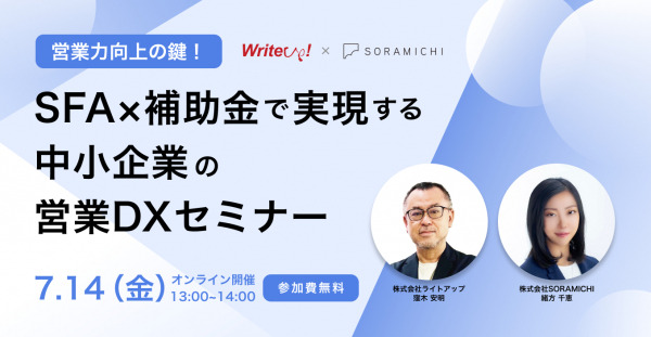 そこで本セミナーでは、幅広い業界のマーケティング課題に向け様々なソリューションを提供する株式会社SORAMICHIと、累計1万社以上の公的資金支援実績を持つライトアップが共同で、中小企業の現状に即した営業DXの実現方法と具体的なステップについて解説致します。