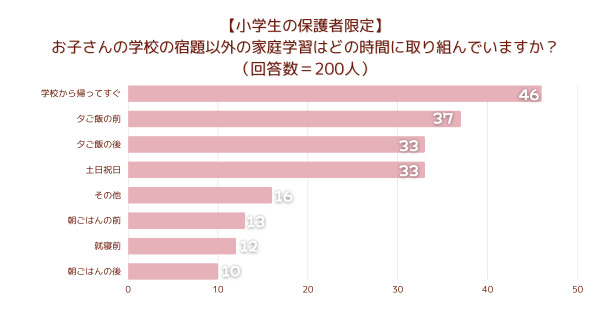 「【小学生の保護者限定】お子さんの学校の宿題以外の家庭学習はどの時間に取り組んでいますか?」とアンケート調査した結果、1位は『学校から帰ってすぐ』でした。