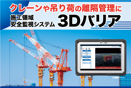 『施工領域安全監視システム3Dバリア』は、GNSS(GPS/GLONASS等)を使用してクレーンのブーム先端や吊り荷の位置情報を3次元座標でリアルタイムに取得、表示し、任意に設定したエリアとの離隔管理や衝突防止の管理を行うシステムです。「作業可能エリア」または「作業禁止エリア」を3次元座標で設定することで、「作業可能エリア」から外れた場合、あるいは「作業禁止エリア」に侵入した場合に回転灯とブザーで危険をお知らせいたします。