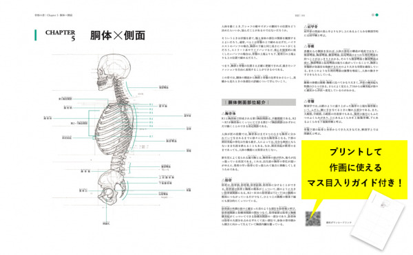 さらに本書内のQRコードからプリントできる上肢、下肢それぞれ正面・側面・背面の作画用マス目入りガイドが付いてくる!