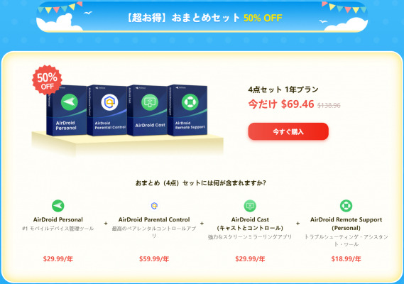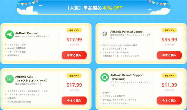 最高のモバイルデバイス管理ツール「AirDroid Personal」、最高の総合的なペアレンタルコントロールアプリ「AirDroid Parental Control」、強力な画面共有と制御ツール「AirDroid Cast(キャストとコントロール)」、トラブルシューティング・アシスタント・ツール「AirDroid Remote Support(Personal)」年間プラン40%OFF!