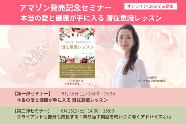 2024年5月18日(土)の第一弾セミナーは、一般の方を対象とし、本当の愛と健康を手に入れるためにどうしたらいいのかについて、本書の著者でありフラクタル心理学開発者の一色真宇と、フラクタル心理学協会主任講師である諏訪智がお話しします。