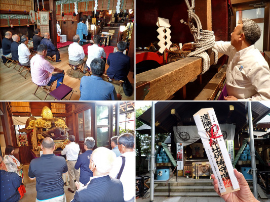 今回祈願が行なわれたのは、「災難を除き、波を乗り切る」ご利益のある東京・築地の波除神社。当日はCカード協議会に加盟する教育機関より、PADIのほかBSAC 、DACS、NAUI 、SNSI、Stars、Three-i各社(ABC順)の代表者が参加。社殿にて祝詞の後、代表としてCカード協議会会長・伊東による玉串奉奠(たまぐしほうてん)が行われ、「海上安全」、「安全潜水」、「好天 凪」が祈願されました。その後、獅子殿に「願い串」を納め、参拝も行なわれました。