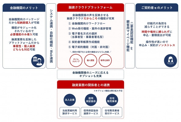 ・Web申込み、電子契約サービス(金消契約、保証委託契約)、顧客用マイページなどがワンシステム化しているので、必要な機能の選択、関連業務の拡張が容易