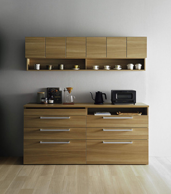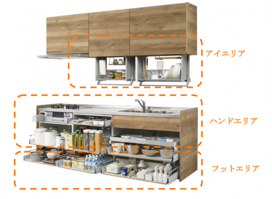 「キッチンは家具、と考える。」をコンセプトとし、2008年の発売以来、新感覚のデザイントレンドを取り入れ進化し続けてきたラクエラ。今回は、これまでの2枚割の扉を3枚割に変更しました。これは上位機種(「CENTRO」、「STEDIA」)で提唱する収納思想「ゾーンコンセプト」に則したもので、使用頻度が高いものを「ハンドエリア」「アイエリア」に、使用頻度が低くストックするものを足元の「フットエリア」に収納できるようになりました。これにより、調理小物を入れる引き出しが内引き出し式ではなくなり、また、人気の深型食器洗い乾燥機を搭載した際の扉のラインもきれいにそろうようになりました。