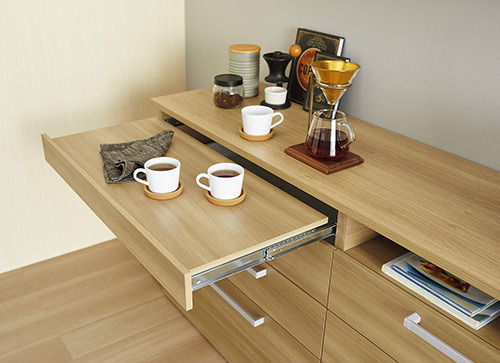 周辺収納では、台輪の在り方を見直して創出したスペースを、カウンター直下に移し、新たな生活提案を搭載した「カグタス収納」が新登場。一時置きスペースとして、使うときだけ引き出せる「カウンター下スライド台」や、小物をさっと収納できる「カウンター下オープン棚」を新提案。収納量は減らさずに、キッチン空間でのお困りごとを解決します。