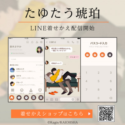海王社×株式会社インクルーズが贈るLINE着せかえシリーズの最新作は、カジス先生の話題作「たゆたう琥珀」です。是非LINE着せかえでも「たゆたう琥珀」の世界観をお楽しみください。