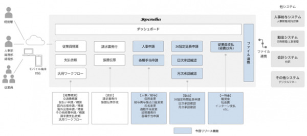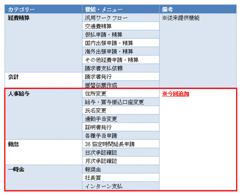 今回新たに追加する機能では、従来の経費精算メニューに加え、人事、給与、勤怠に関する申請・承認機能に対応し、従業員の業務効率化を支援します。