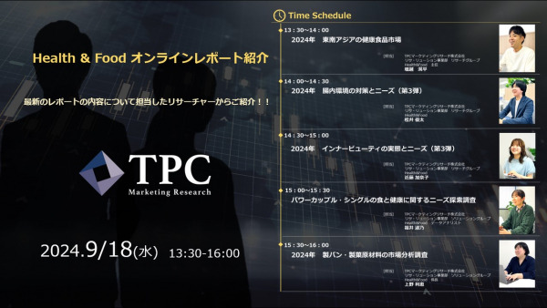 リサ・リューション事業を展開するTPCマーケティングリサーチ株式会社(代表取締役社長:松本 竜馬)は、2024年9月18日にHealth & Foodオンラインレポート紹介を開催いたします。