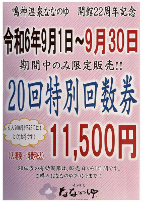 のろのろと迷走した台風10号もようやく過ぎ去り、温泉で疲れを癒やしていただこうと特別入浴券を発売することにいたしました。