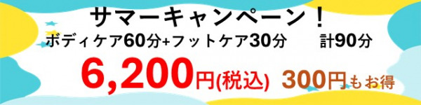 サマーキャンペーン!はボディケア60分+フットケア30分の計90分の施術が6,200円(税込)と、通常よりも300円もお得なキャンペーンです!