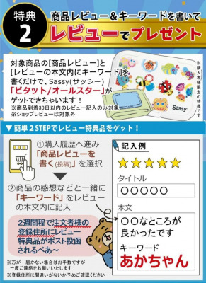 対象商品を当店でご購入の上、「商品レビュー」と「レビューの本文内にキーワード」を書くと、サッシー「ビタット/オールスター」をプレゼントいたします。