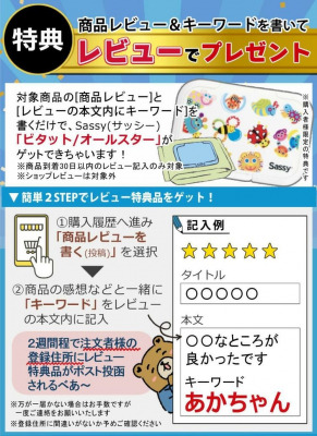 対象商品を当店でご購入の上、「商品レビュー」と「レビューの本文内にキーワード」を書くと、サッシー「ビタット/オールスター」をプレゼントいたします。