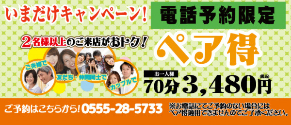 ペア得キャンペーン!は2名以上のお電話予約で通常のボディケア60分3,480円(税込)がお値段そのままで70分受けられるキャンペーンとなっております!