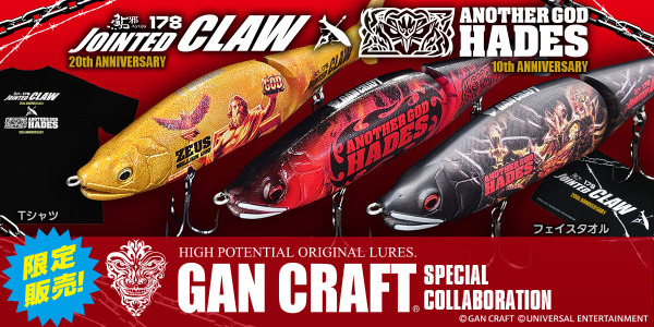 バックには「JOINTED CLAW178×ANOTHER GOD HADES」のコラボロゴ、フロントはシンプルに「GAN CRAFT×UNIVERSAL ENTERTAINMENT」のロゴを配置した着やすいデザインです。