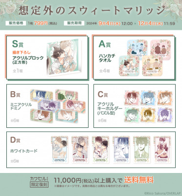 S賞アクリルブロックは作者の描き下ろしイラストを使用しており、「結城 律」と「まりも」の表情がリンクしておりファンなら絶対に欲しい一点です!その他のラインナップも“結婚”をテーマにしたデザインで作品の世界感を存分に味わっていただけます!