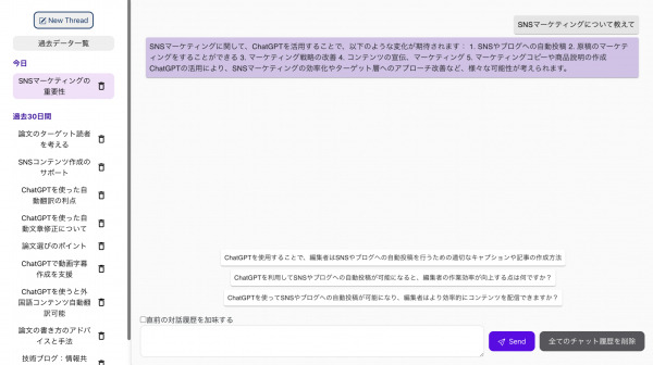 このChatBridのWebアプリの対話画面を使ったユーザから、このままエンドユーザに使ってもらいたいとの要望をいただくようになりました。そこでこのたび、ChatGPT Webアプリなみ以上操作性、機能を実現すべく過去履歴の、それらタイトルの自動要約、編集・削除機能、さらには、ユーザの「次の質問」を予想して3,4つを生成し、ボタンにしています。