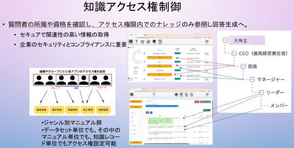 この知識アクセス権管理機能では、組織における垂直(役員、部課長~一般社員)、水平(企画、営業、開発etc.間の部外秘管理)方向で閲覧可能な知識を、知識ジャンル(データセット)単位、マニュアル単位、さらには最小の知識レコード単位で立てたフラグに従って、識別し、その中からだけ当該質問者がアクセスして良いものだけをLLMに送る素材とすることができます。これにより、職級が下位の質問者が上位階級のスタッフ向けの知識の混ざった回答を得ることが不可能となります。また、水平方向では、例えば研究所の一般社員が知りえる次世代商品の知識に基づいた回答を、営業部長が許可なく得ることは出来なくなります。