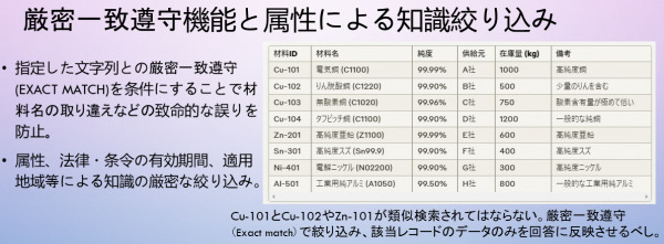厳密一致遵守機能:RAGの通常の類似検索では少しの文字の違いを同一視しがちです。LLMも似て非なる名称や型番(以下、致命的キーワードと呼ぶ)について、しばしば取り違えを起こします。これは時に、その回答を信じた人にとって致命的なエラーとなりえます。そこで、素材名、薬剤名、重要な分量数字などについては、それらのキーが厳密に一致する知識のみヒットさせる機能を備えました。