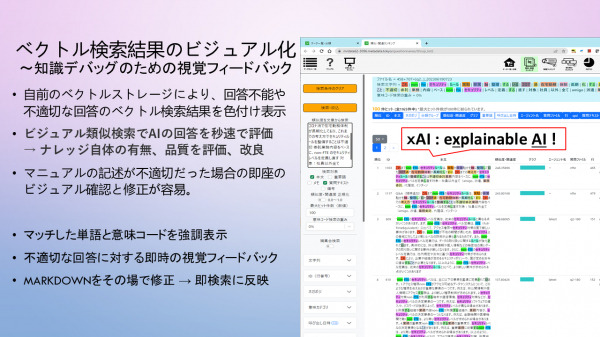 ・ベクトル検索結果のビジュアル化(xAI) : ~知識デバッグのための視覚フィードバック 回答の適不適・知識不足を秒速で目視、評価可能