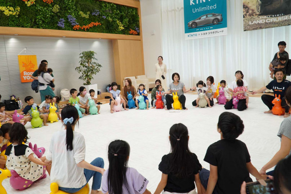 約30名の子どもたちが参加し、ロディに向かって走ったり、かえる飛びをしたり、ヨガのポーズを楽しみました。パパやママにサポートしてもらいながらポーズに挑戦する未就学児のお子さんや様々なポーズに「気持ちいい」「難しい」など、自分の身体と向き合いないがら楽しんだ小学生。