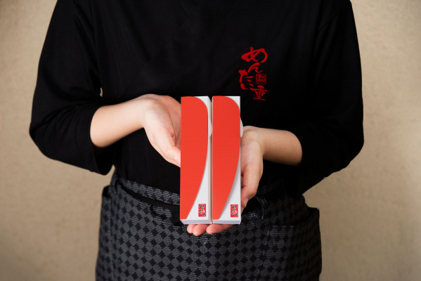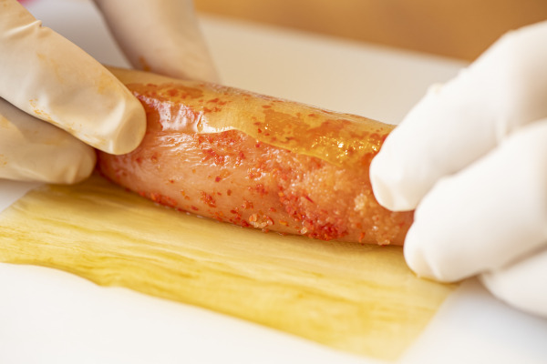 当店で使用する明太子は、昆布や唐辛子など様々な旨味成分を配合した調味液に漬け込み、じっくりと味を染み込ませております。味の均一化を図るため、品質や粒感・たれの漬け込み具合など、熟練した職人が日々確認・調整を行います。ここまでの工程でも十分に美味しくお召し上がりいただけますが、更に旨味成分を浸透させるため、特製調味だれに漬け込んだ昆布を明太子一つひとつに手作業で巻き付けて「昆布巻き明太子」にしてご提供しています。他にはない味わいを、どうぞご賞味ください。