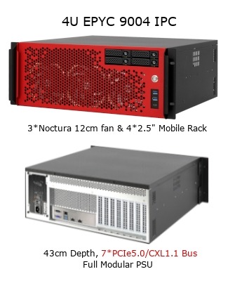 I4EG08FBシリーズは、AMD Zen4 EPYC 9004シリーズCPU(LGA-6096, ソケットSP5)1基を搭載した奥行き50cmの4Uラックマウントシステムで、CPUの水冷化も可能なシステムです。