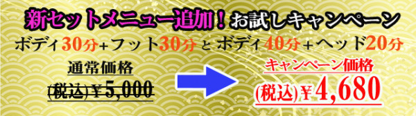 新セットメニュー!お試しキャンペーンはボディ30分+フット30分とボディ40分+ヘッド20分が通常価格5,000(税込)のところなんと4,680円(税込)のお得なキャンペーンです!