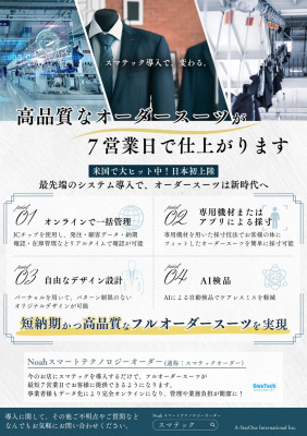 スマート生産システム「スマテック」は、テクノロジーを駆使することで業界が抱える課題を一気に解決するシステムです。オーダースーツの発注から納期管理、顧客管理に至るまでのプロセスをワンストップで管理できる業界最先端のオンラインシステムにより、煩雑な事務事業を効率化します。また、これにより従来60日程度かかっていた納期を最短7営業日にまで短縮し、スピーディかつ高品質なフルオーダースーツの提供を実現しています。イラスト付き専用カタログによる顧客体験の最大化やICチップ管理やAI検品制度の導入によるケアレスミスの防止にも取り組んでおります。さらに、スマートフォンを使って採寸が可能な専用アプリ「スマートフィッタープロ」との連動により、柔軟な事業運営を可能にするスピード、クオリティ、プライシング、そして幅広いデザインを兼ね備えた業界最先端のサービスです。