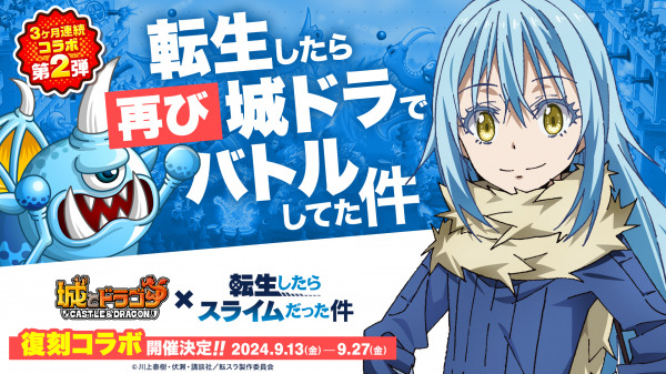 9月13日(金)より『城とドラゴン』にてTVアニメ『転生したらスライムだった件』との復刻コラボイベントを開催することが決定いたしました。コラボ限定キャラとして「リムル=テンペスト」や、城ドラキャラの新しい激レアお着替えが登場するほか、9月6日(金)からは「コラボ直前!わくわくリポストキャンペーン」がコラボに先駆けてスタートいたします。キャンペーンへのご参加お待ちしております!