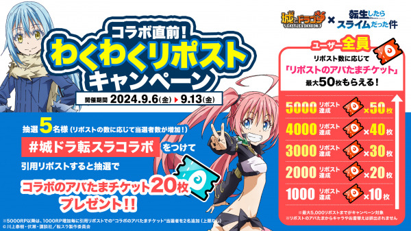 そしてハッシュタグ「#城ドラ転スラコラボ」をつけて引用リポストされた方の中から抽選で5名様に、引用リポスト賞として「コラボのアバたまチケット」20枚を贈呈!さらに5,000リポスト以降は、1,000リポスト増加毎に引用リポスト賞の当選者が2名ずつ追加されます!引用リポストする際は、ぜひハッシュタグとあわせて、「コラボイベントが発表された時の感想」や「コラボイベントの楽しみにしているポイント」などもコメントしてみてください!