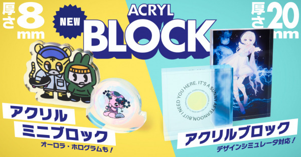 アクリルブロックの中でも厚さやサイズが異なる2商品は、お手軽にグッズを作りたい方、素材や形にこだわりたい方、それぞれの目的に合わせてお選びいただけます。