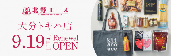 2014年4月トキハ本店にオープンした北野エースは、2024年9月19日(木)に全面リニューアルいたします。売場面積が広がり、お買い物がしやすいレイアウトに変更いたしました。日常の食卓に並ぶ日配品から調味料、冷凍食品、菓子、ギフト商品など、約3,700アイテムを取り揃えました。こだわりにあふれた商品セレクトで、食を通じて笑顔になれる時間をご提案いたします。