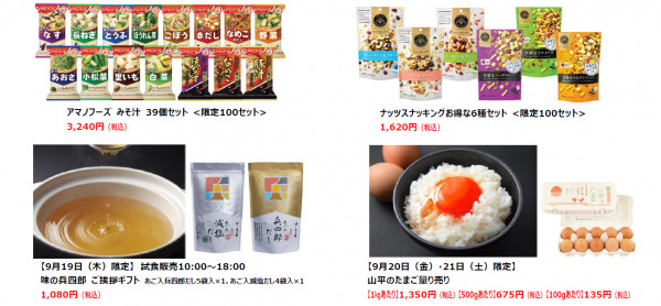 リニューアルオープン限定商品として「お楽しみHappy Bag」や、「RENEWAL OPEN企画」をご用意。Happy Bagは、「アマノフーズ みそ汁」、「ナッツスナッキングお得な6種セット」の2種類。RENEWAL OPEN企画では、「味の兵四郎 試食販売」や「山平のたまご量り売り」を実施いたします。