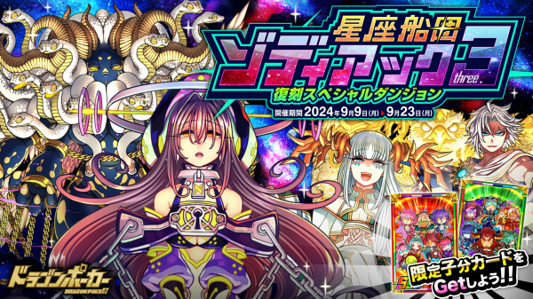 9月9日(月)メンテナンス後より、復刻スペシャルダンジョン「星座船団ゾディアック3」を開催いたします。今回のスペシャルダンジョンでは「大星雲竜アンドロメダ」などが登場!一緒に冒険する仲間と協力し、ダンジョンクリアを目指しましょう!