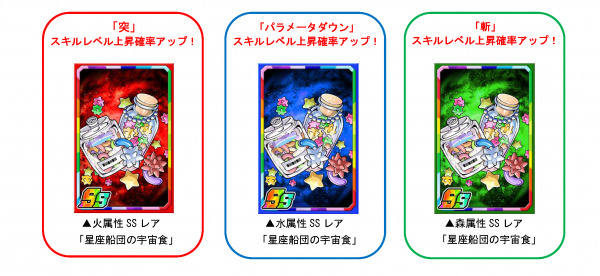 「星雲竜P」を使い素材ガチャを回すと、限定強化素材「星座船団の宇宙食」を手に入れることができます。一部のモンスターに使うと強化値2倍の効果があるほか、突・パラメータダウン・斬のスキルレベル上昇確率もアップします。