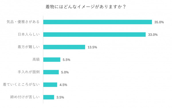 着物に対するイメージをたずねたところ、最も多かったのが「気品・優雅さがある」で35%(前回比-7.5ポイント)でした。次いで、「日本人らしい」33%(前回比+3ポイント)、「着方が難しい」13.5%(前回比+2ポイント)、「高級」5.5%(前回比+2.5ポイント)、「手入れが面倒」5%(前回比+0.5ポイント)、「着ていくところがない」4.5%(前回比-1ポイント)、「締め付けが苦しい」3.5%(前回比+3ポイント)と続きます。