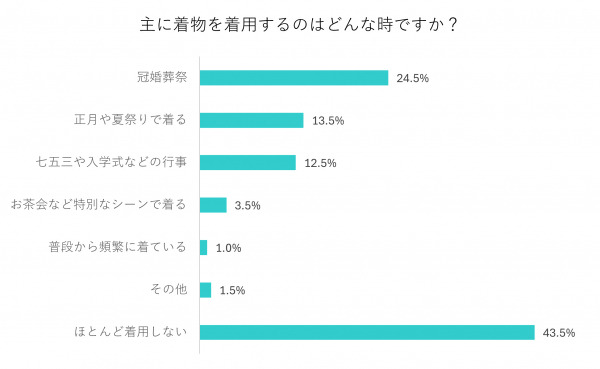 「冠婚葬祭」24.5%、「正月や夏祭りで着る」13.5%、「七五三や入学式などの行事」12.5%、「お茶会など特別なシーンで着る」3.5%、「普段から頻繁に着ている」1%、「その他」1.5%という結果に。前回同様、着物を着る機会が多いのは冠婚葬祭であることがわかりました。